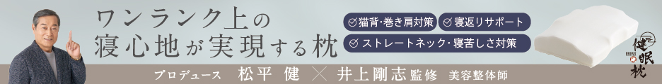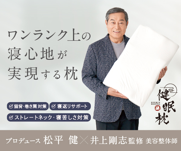 「健眠枕」は、俳優の松平健さんがプロデュースし、美容整体師の井上剛志さんが監修した枕です。現代人のストレートネックや猫背、巻き肩などの悩みに対応するため、約1年間の開発期間を経て完成しました。中反発素材の枕に肩を乗せることで固まった肩こりの筋肉をほぐし、猫背や巻き肩を予防するほか、首をしっかりと支える構造でストレートネック対策と寝苦しさの軽減に効果があります。また、スムーズな寝返りを可能としたほか、横向きでも身体を真直ぐに保つなど、快適な睡眠をサポートします。